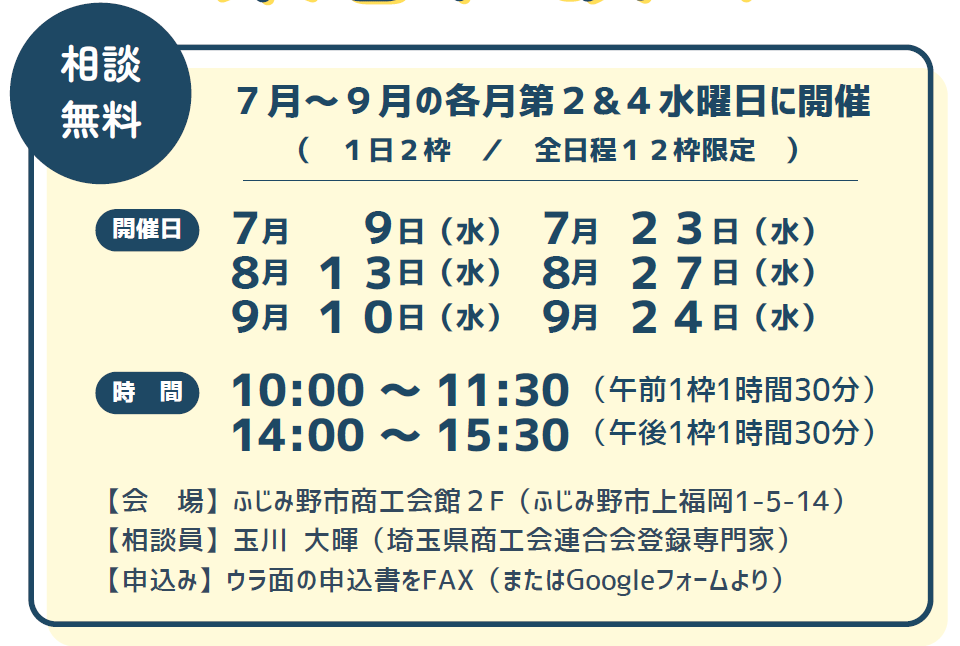 ふじみ野市商工会では、7月~9月(第2&第4水曜日)の期間限定で集客相談会を開催しております。
