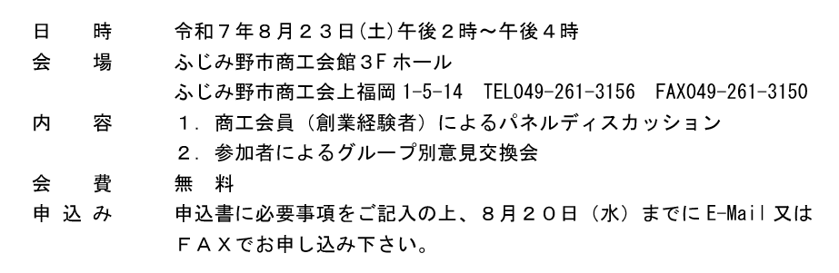 ふじみ野市商工会では、創業・副業セミナー受講者支援の一環として、創業・副業セミナー申込者を対象にした懇談会を開催いたします。
