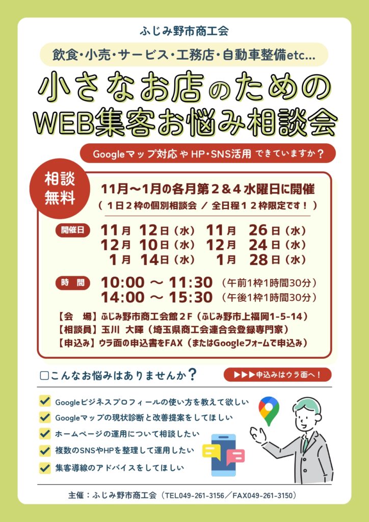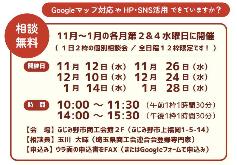 ふじみ野市商工会では、11月~1月(第2&第4水曜日)の期間限定で集客相談会を開催いたします。
