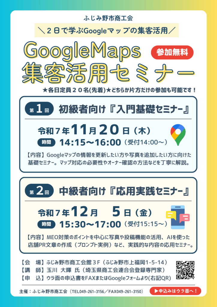 11月20日(木)と12月5日(金)に、ふじみ野市商工会にて「Googleマップ集客活用セミナー」を開催します。